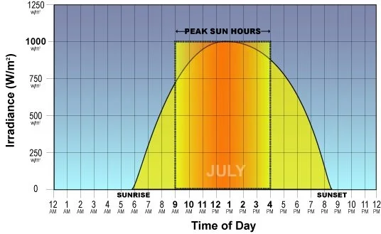 Not all daylight hours are the same. Photovoltaic (PV) cells generate DC electricity from the sun photons “most efficiently” during daylight peak hours. Peak sun hours is when the intensity of the Sun is 1,000 watts of photovoltaic power per square meter. Also, it must be understood that PV’s modules do not generate electricity from the radiant heat of the Sun, but from Sun Protons.