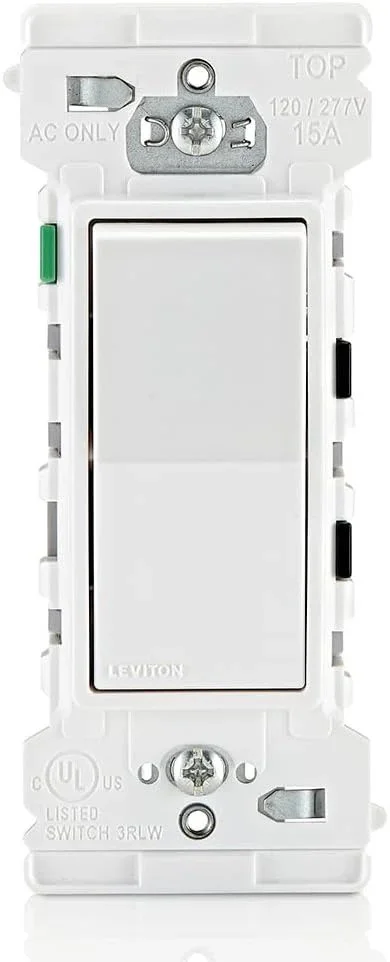 The Tiny Off-Grid House light switches will incorporate Leviton Lever Edge 15 Amps Rocker Switches, for the single-pole (Model # E5601-W) & 3-way switches (Model # E5603-W). The Lever Edge color coded terminals help prevents miswiring during installation.